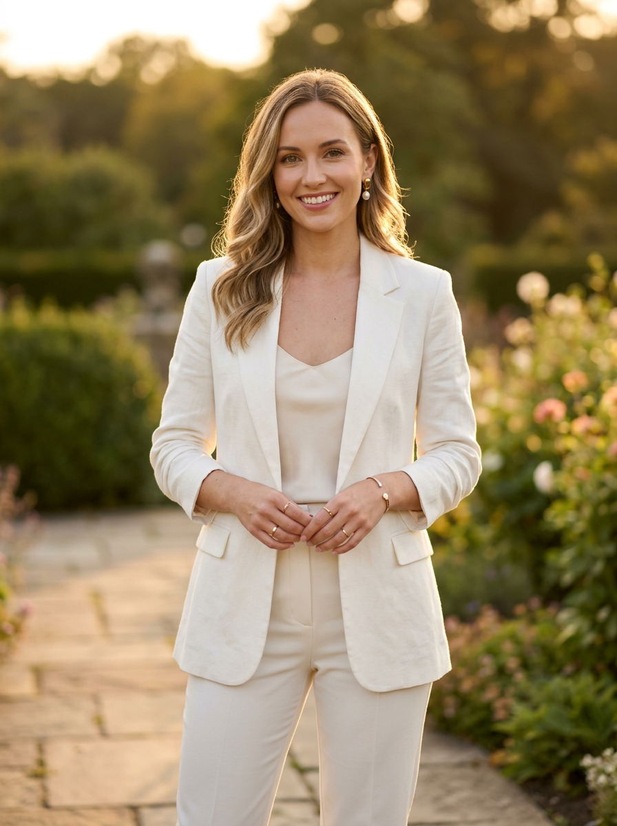 model in ivory linen blazer over cream camisole with pearl earrings , refined minimalist style, soft neutral palette, golden hour lighting