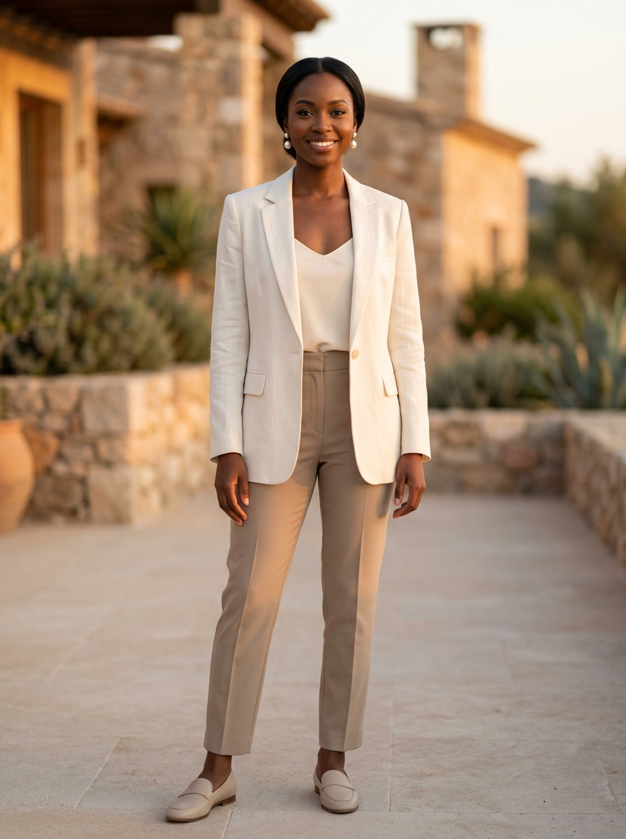 model in ivory linen blazer over cream camisole with pearl earrings , refined minimalist style, soft neutral palette, golden hour lighting
