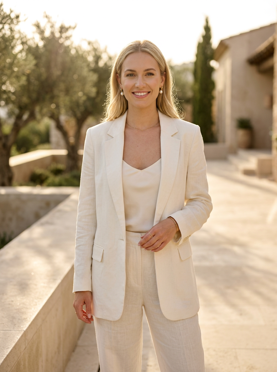model in ivory linen blazer over cream camisole with pearl earrings , refined minimalist style, soft neutral palette, golden hour lighting