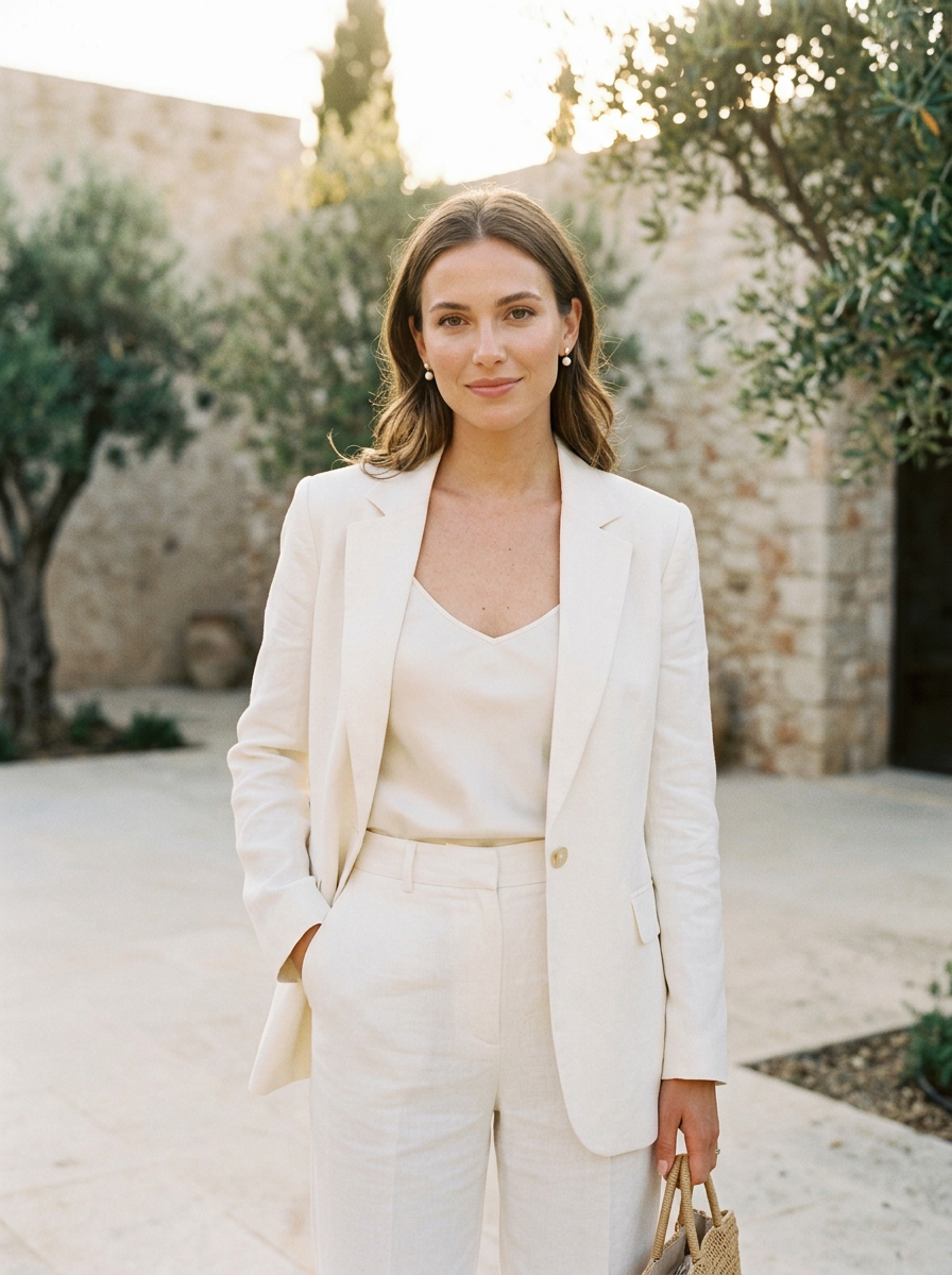 model in ivory linen blazer over cream camisole with pearl earrings , refined minimalist style, soft neutral palette, golden hour lighting