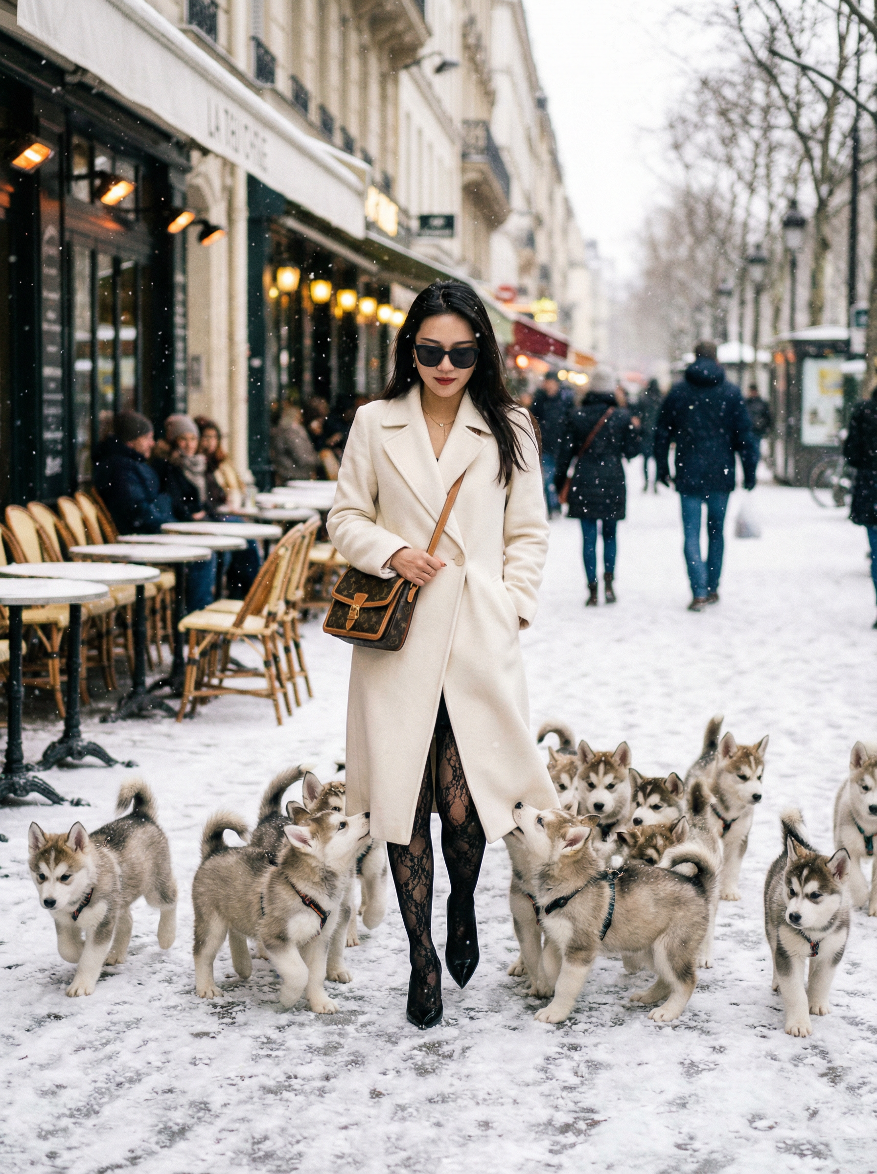 model in ivory long wool coat, lace tights, stiletto pumps, dark sunglasses, designer shoulder bag walking along a snowy european boulevard outside luxury cafes, 15 fluffy husky puppies playfully running around the model’s feet and tugging at the coat hem, gentle snowfall, high-fashion street photography look, crisp winter light, cinematic realism