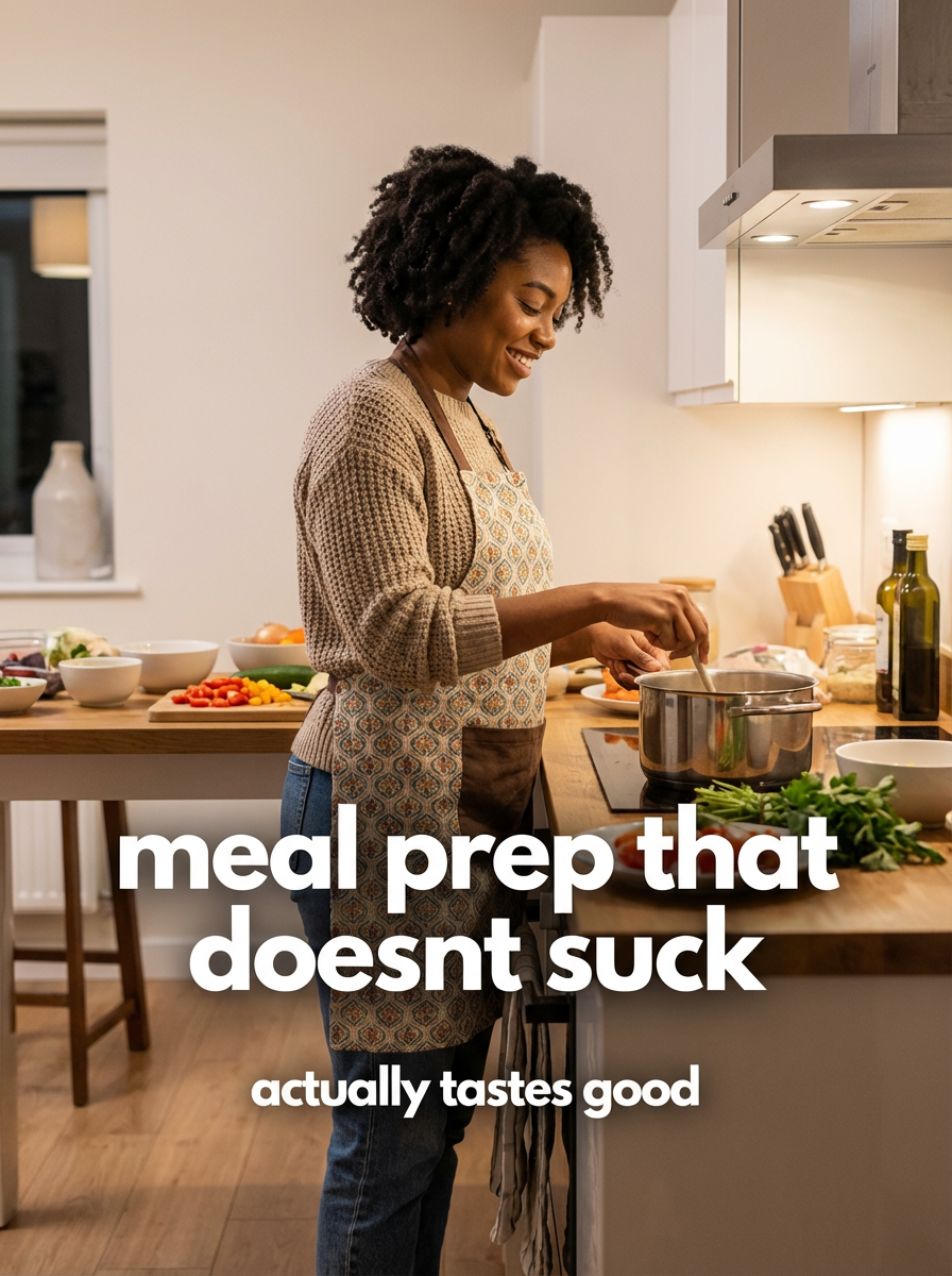 model in kitchen apron over cute outfit in modern kitchen, cooking, ingredients spread out, warm home lighting. TikTok text overlay: "meal prep that doesnt suck" smaller text: "(actually tastes good)" , do not show tiktok interface