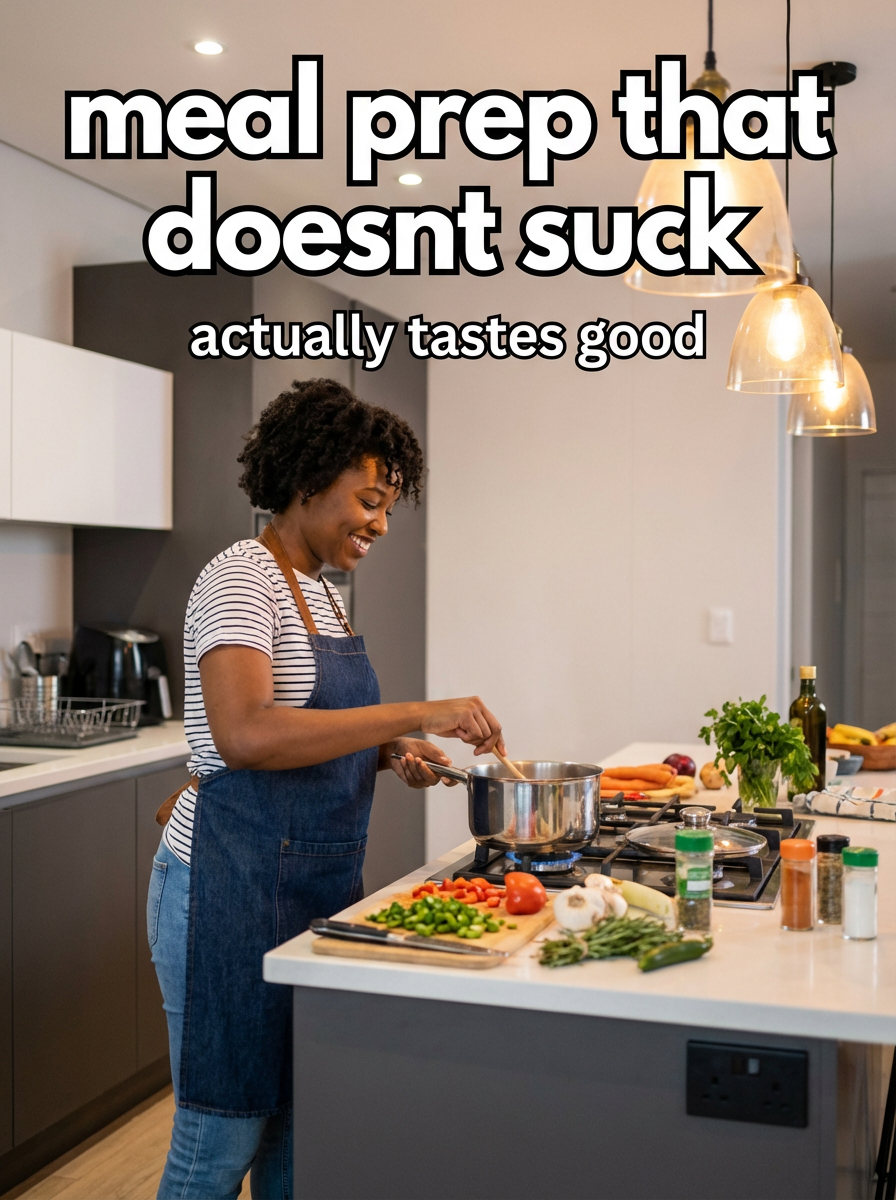 model in kitchen apron over cute outfit in modern kitchen, cooking, ingredients spread out, warm home lighting. TikTok-style text overlay with white text with black outline: "meal prep that doesnt suck" smaller text: "(actually tastes good)" , do not show tiktok interface or logo