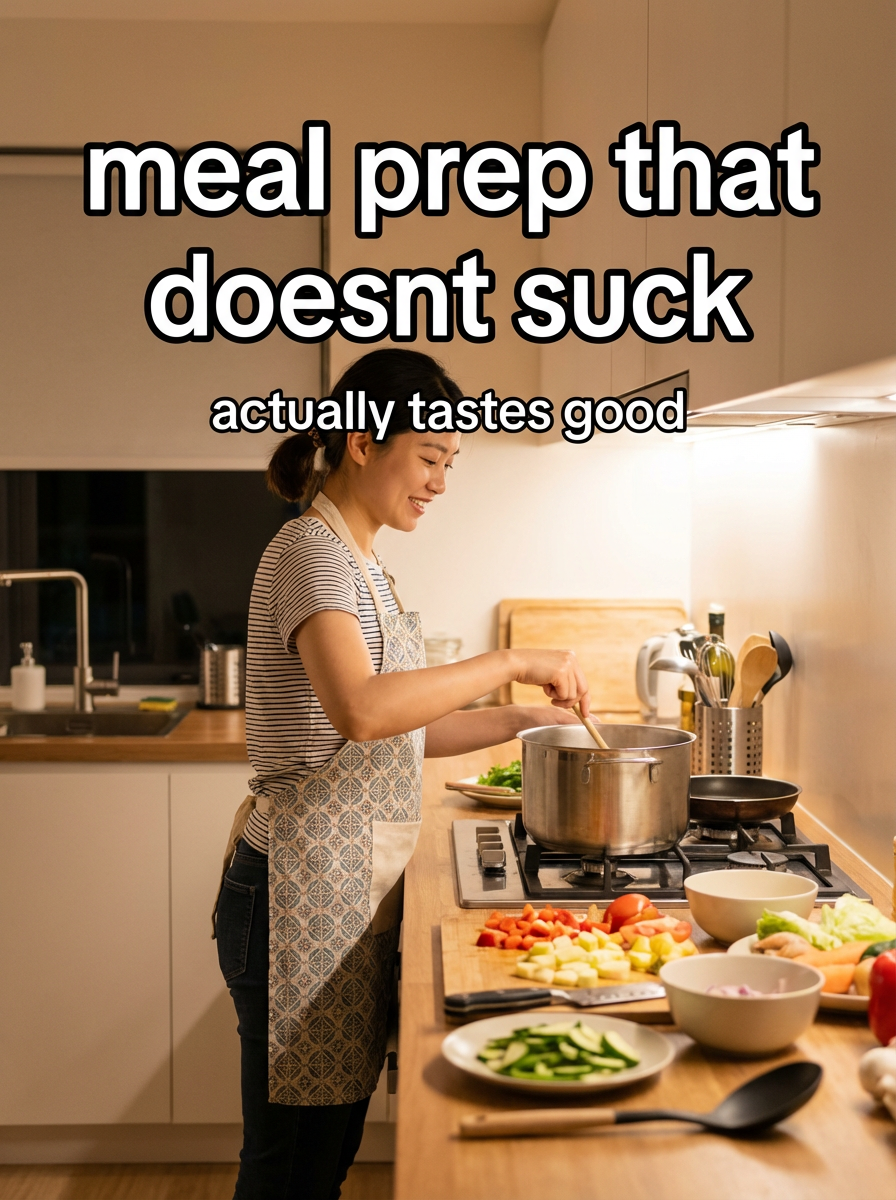 model in kitchen apron over cute outfit in modern kitchen, cooking, ingredients spread out, warm home lighting. TikTok-style text overlay with white text with black outline: "meal prep that doesnt suck" smaller text: "(actually tastes good)" , do not show tiktok interface or logo