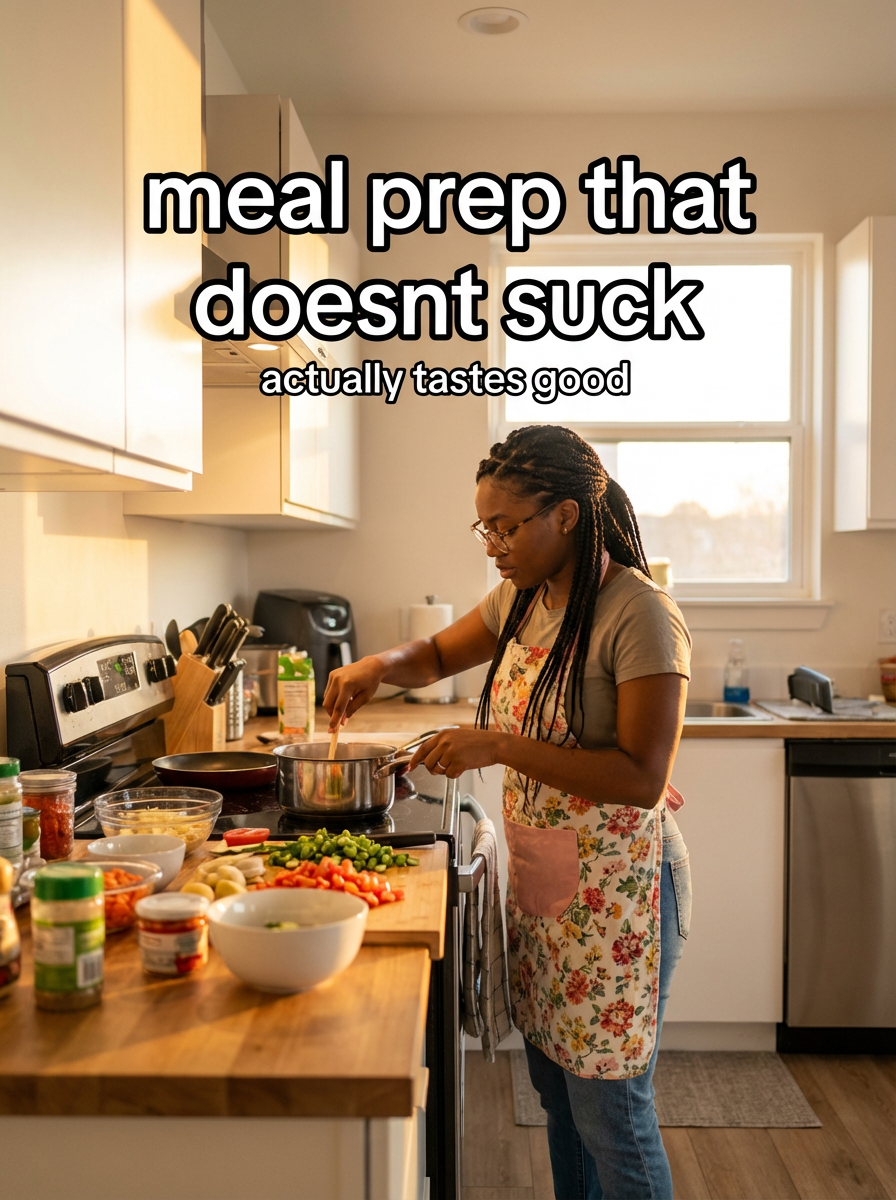 model in kitchen apron over cute outfit in modern kitchen, cooking, ingredients spread out, warm home lighting. TikTok-style text overlay with white text with black outline: "meal prep that doesnt suck" smaller text: "(actually tastes good)" , do not show tiktok interface or logo