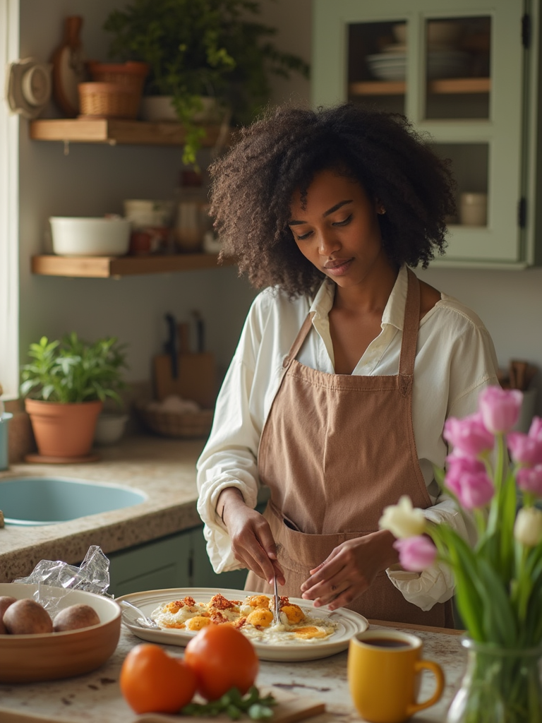 model in kitchen making breakfast, wearing vintage apron over casual outfit , fresh ingredients and flowers on counter, soft morning light, slow living aesthetic