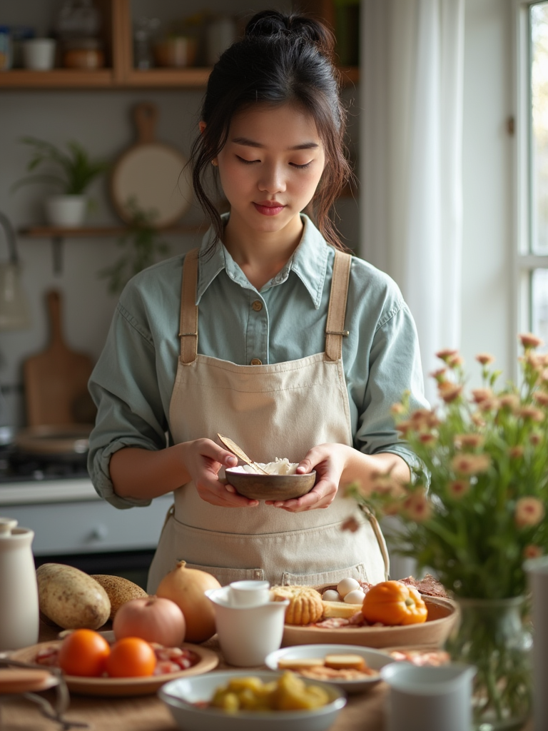 model in kitchen making breakfast, wearing vintage apron over casual outfit , fresh ingredients and flowers on counter, soft morning light, slow living aesthetic