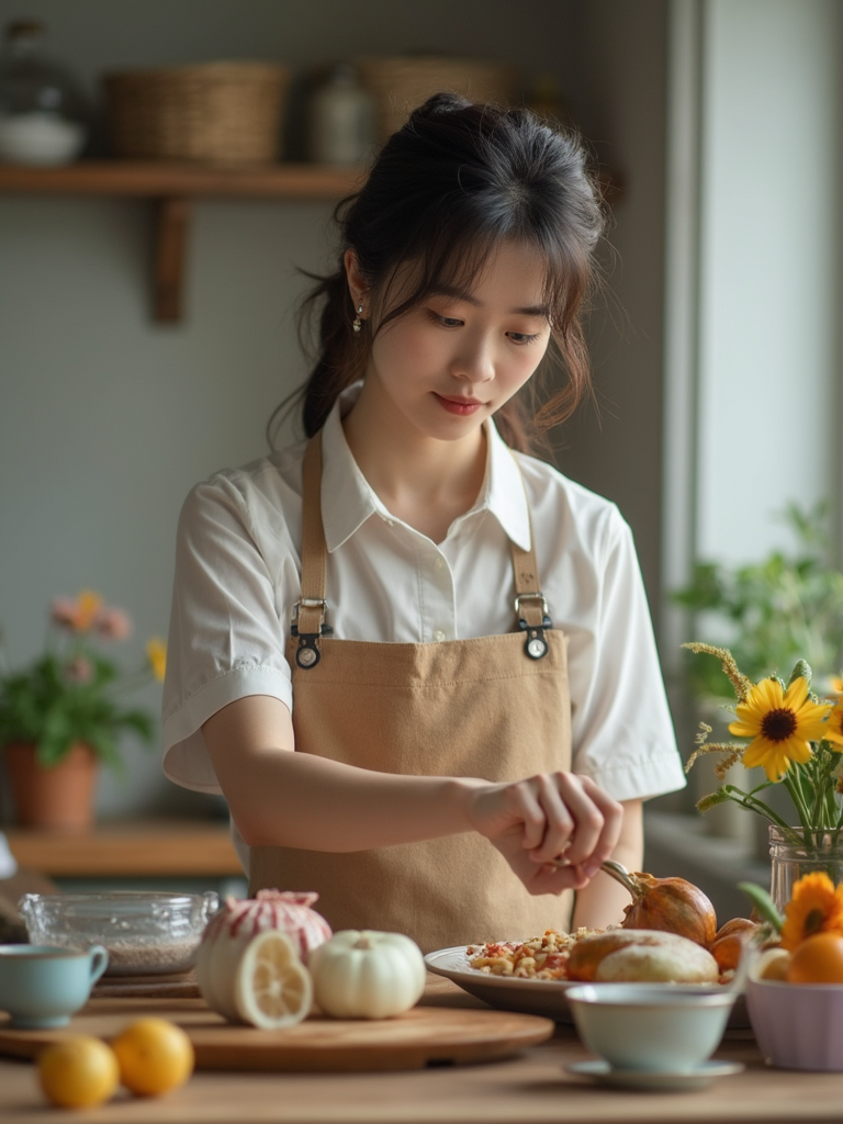 model in kitchen making breakfast, wearing vintage apron over casual outfit , fresh ingredients and flowers on counter, soft morning light, slow living aesthetic