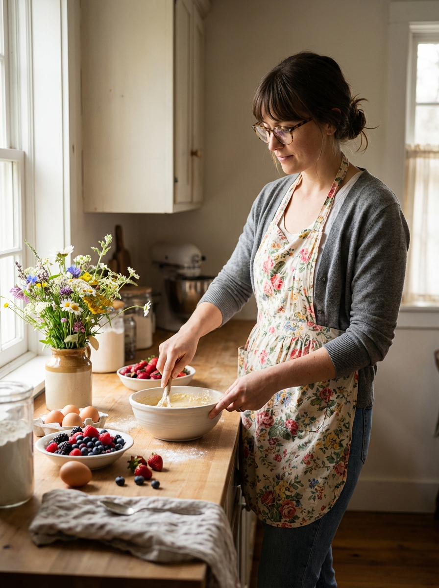 model in kitchen making breakfast, wearing vintage apron over casual outfit , fresh ingredients and flowers on counter, soft morning light, slow living aesthetic