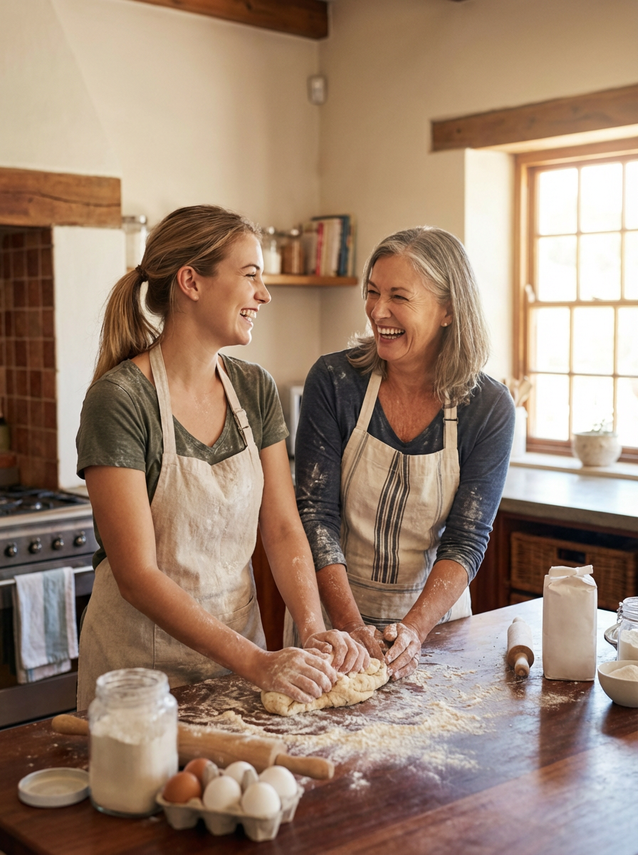 model in kitchen with mom, baking together, flour-dusted aprons, warm family moment