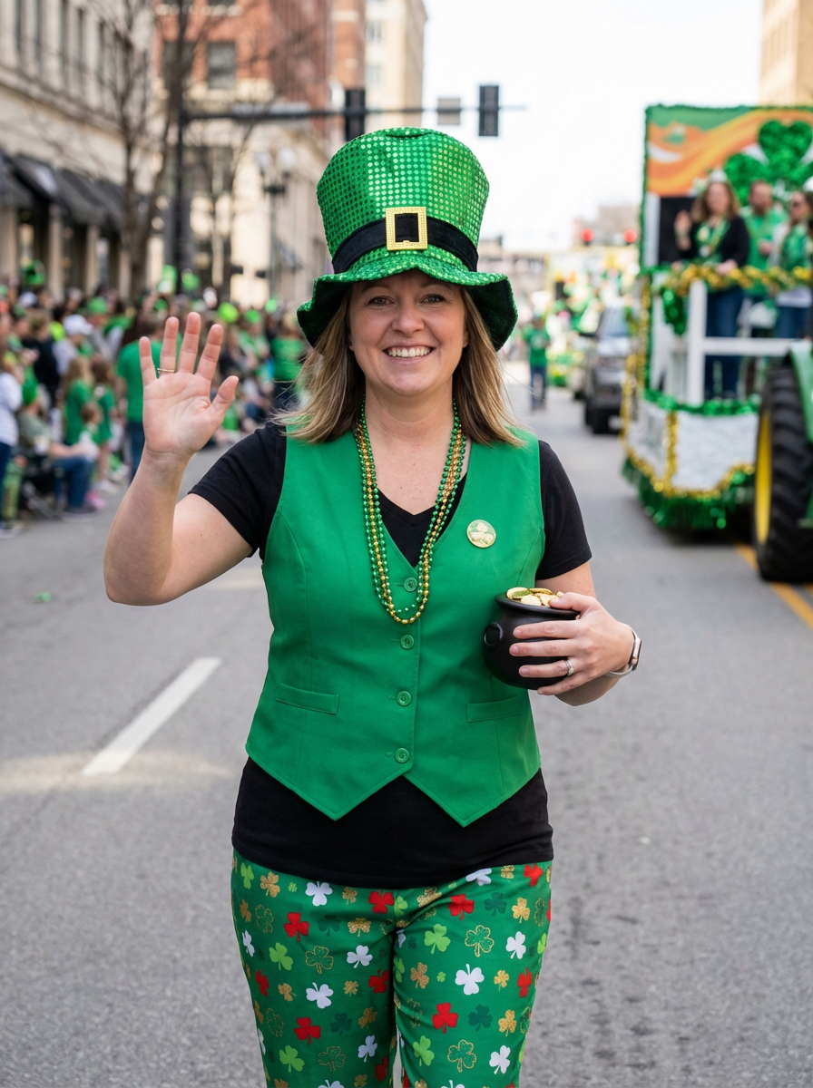 model in leprechaun inspired outfit, green hat, festive costume elements, parade setting
