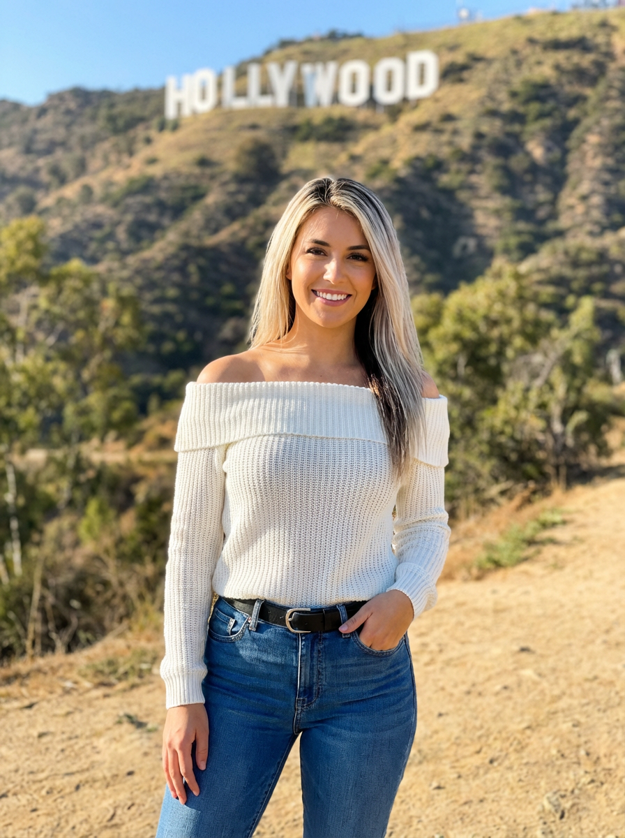 model in Los Angeles with the Hollywood sign in the background
