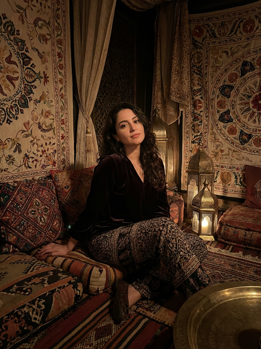 model in luxe bohemian setting, cushions and tapestries, relaxed sensual atmosphere