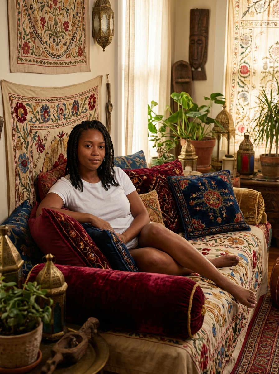 model in luxe bohemian setting, cushions and tapestries, relaxed sensual atmosphere