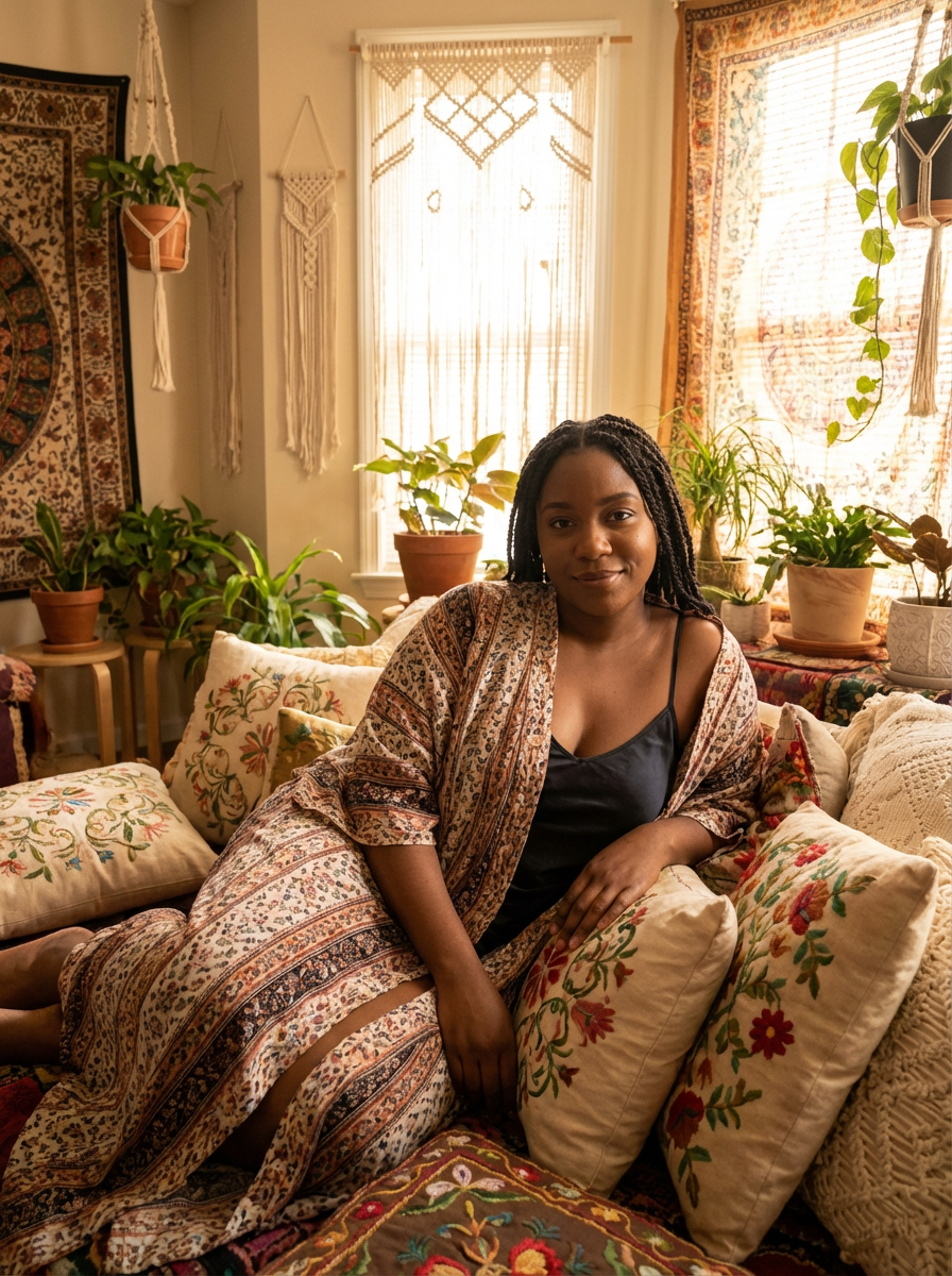 model in luxe bohemian setting, cushions and tapestries, relaxed sensual atmosphere