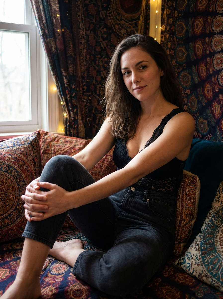 model in luxe bohemian setting, cushions and tapestries, relaxed sensual atmosphere