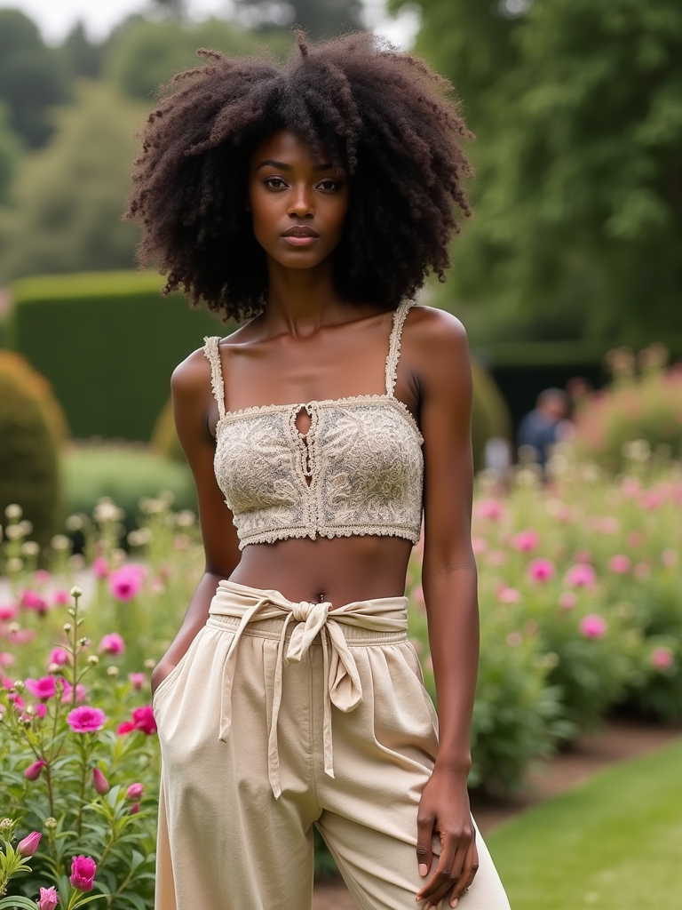 model in Luxembourg Gardens, wearing a light bohemian top with wide-leg pants , surrounded by blooming flowers