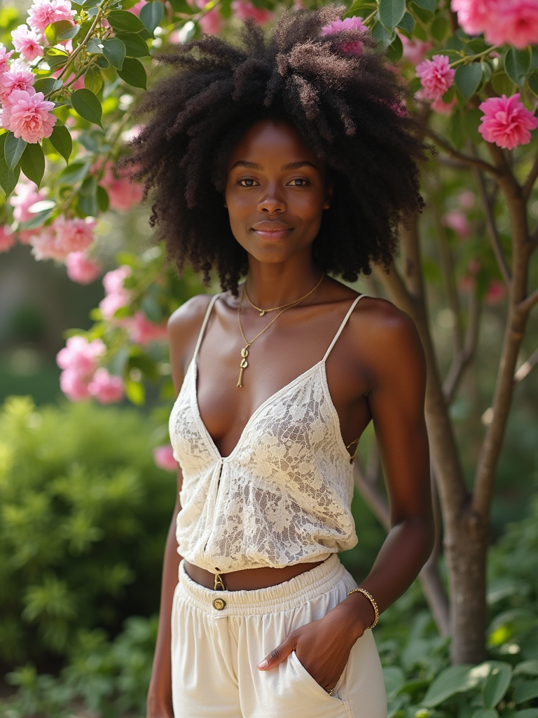 model in Luxembourg Gardens, wearing a light bohemian top with wide-leg pants , surrounded by blooming flowers