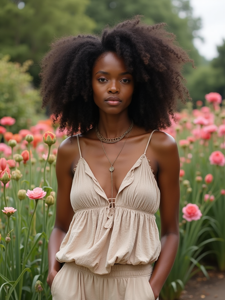 model in Luxembourg Gardens, wearing a light bohemian top with wide-leg pants , surrounded by blooming flowers