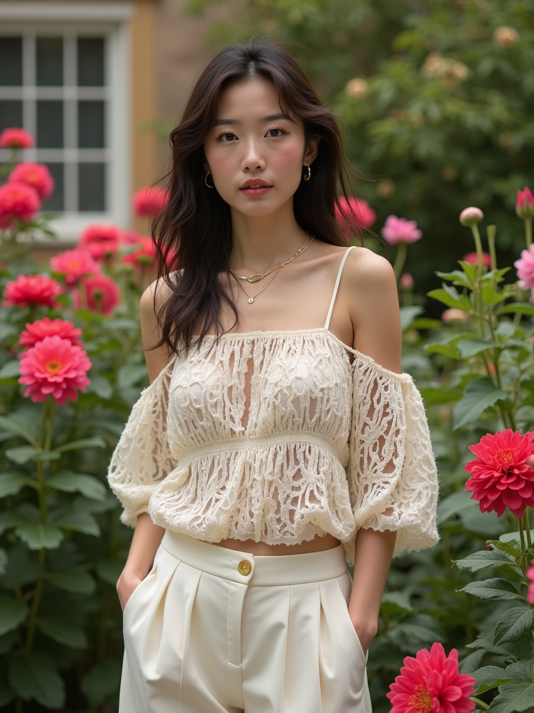 model in Luxembourg Gardens, wearing a light bohemian top with wide-leg pants , surrounded by blooming flowers