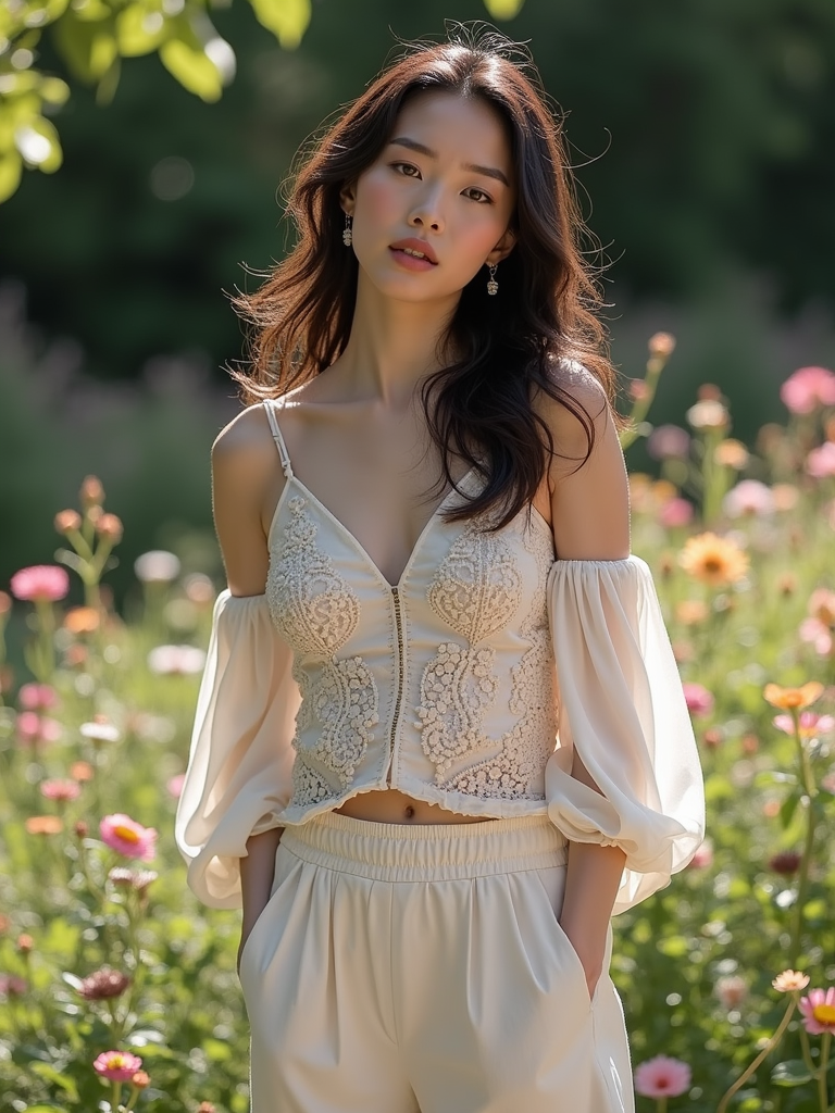 model in Luxembourg Gardens, wearing a light bohemian top with wide-leg pants , surrounded by blooming flowers