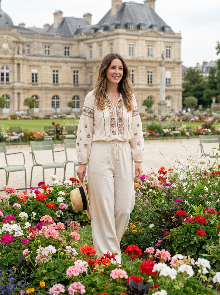 model in Luxembourg Gardens, wearing a light bohemian top with wide-leg pants , surrounded by blooming flowers
