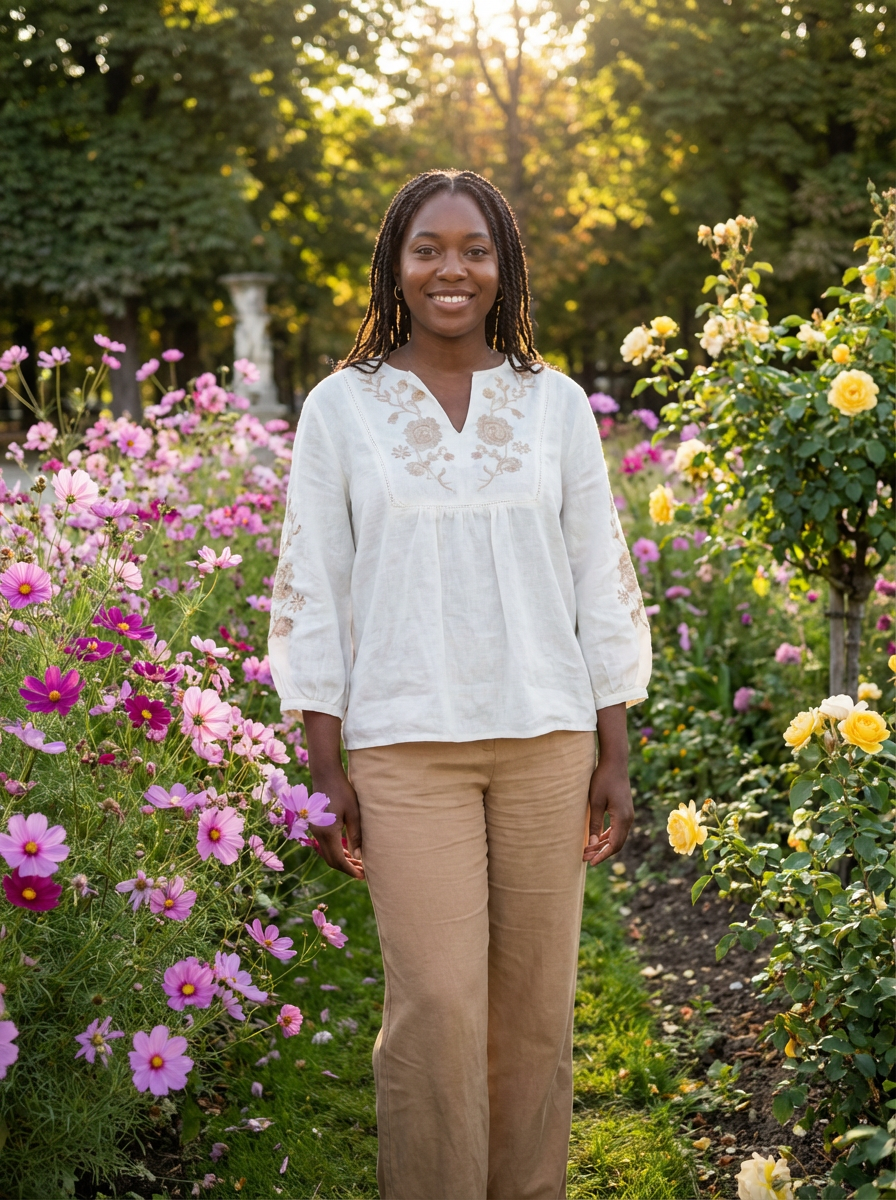 model in Luxembourg Gardens, wearing a light bohemian top with wide-leg pants , surrounded by blooming flowers
