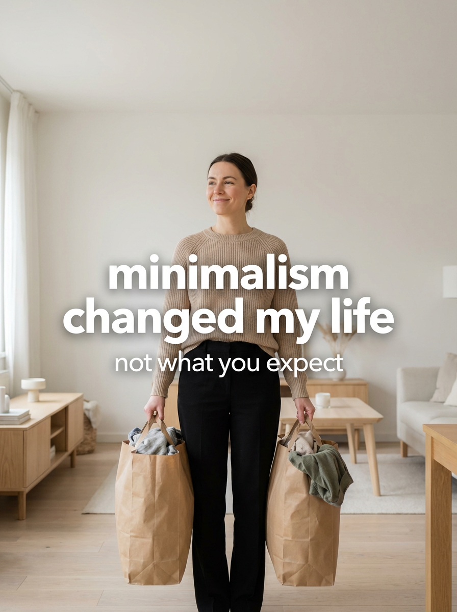 model in minimalist outfit in decluttered room, holding donation bags, satisfied expression, clean lighting. TikTok text overlay: "minimalism changed my life" smaller text: "(not what you expect)" , do not show tiktok interface