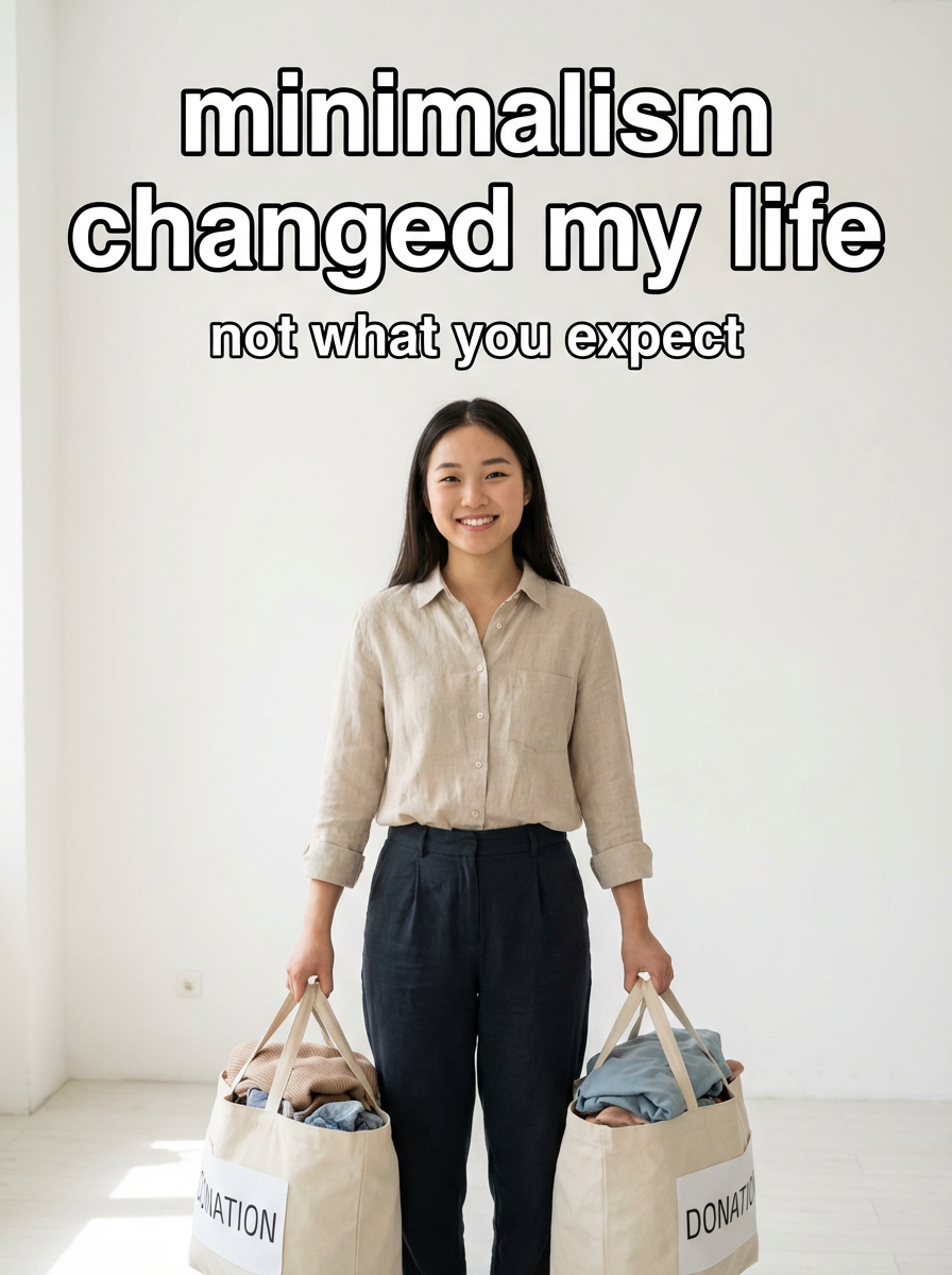 model in minimalist outfit in decluttered room, holding donation bags, satisfied expression, clean lighting. TikTok-style text overlay with white text with black outline: "minimalism changed my life" smaller text: "(not what you expect)" , do not show tiktok interface or logo