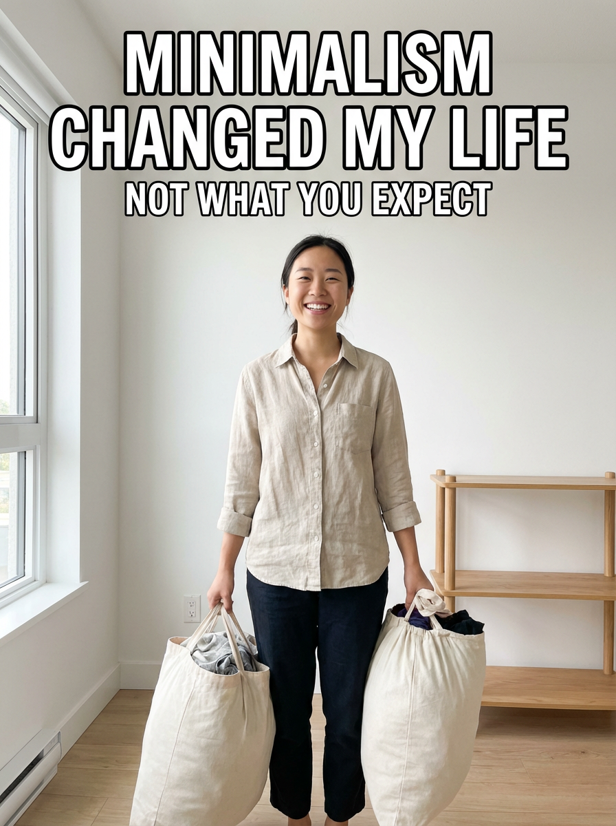 model in minimalist outfit in decluttered room, holding donation bags, satisfied expression, clean lighting. TikTok-style text overlay with white text with black outline: "minimalism changed my life" smaller text: "(not what you expect)" , do not show tiktok interface or logo