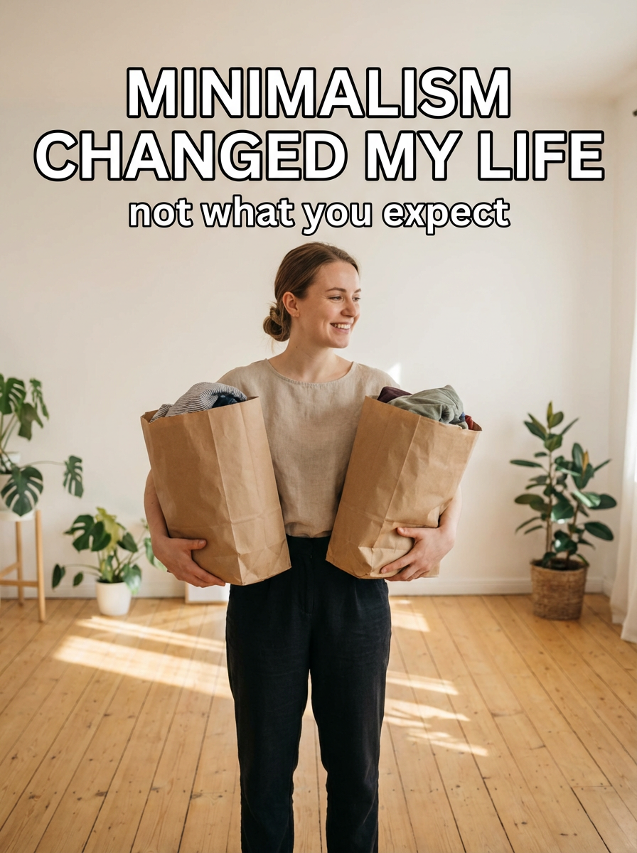 model in minimalist outfit in decluttered room, holding donation bags, satisfied expression, clean lighting. TikTok-style text overlay with white text with black outline: "minimalism changed my life" smaller text: "(not what you expect)" , do not show tiktok interface or logo
