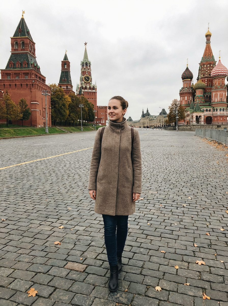 model in Moscow with the Kremlin in the background