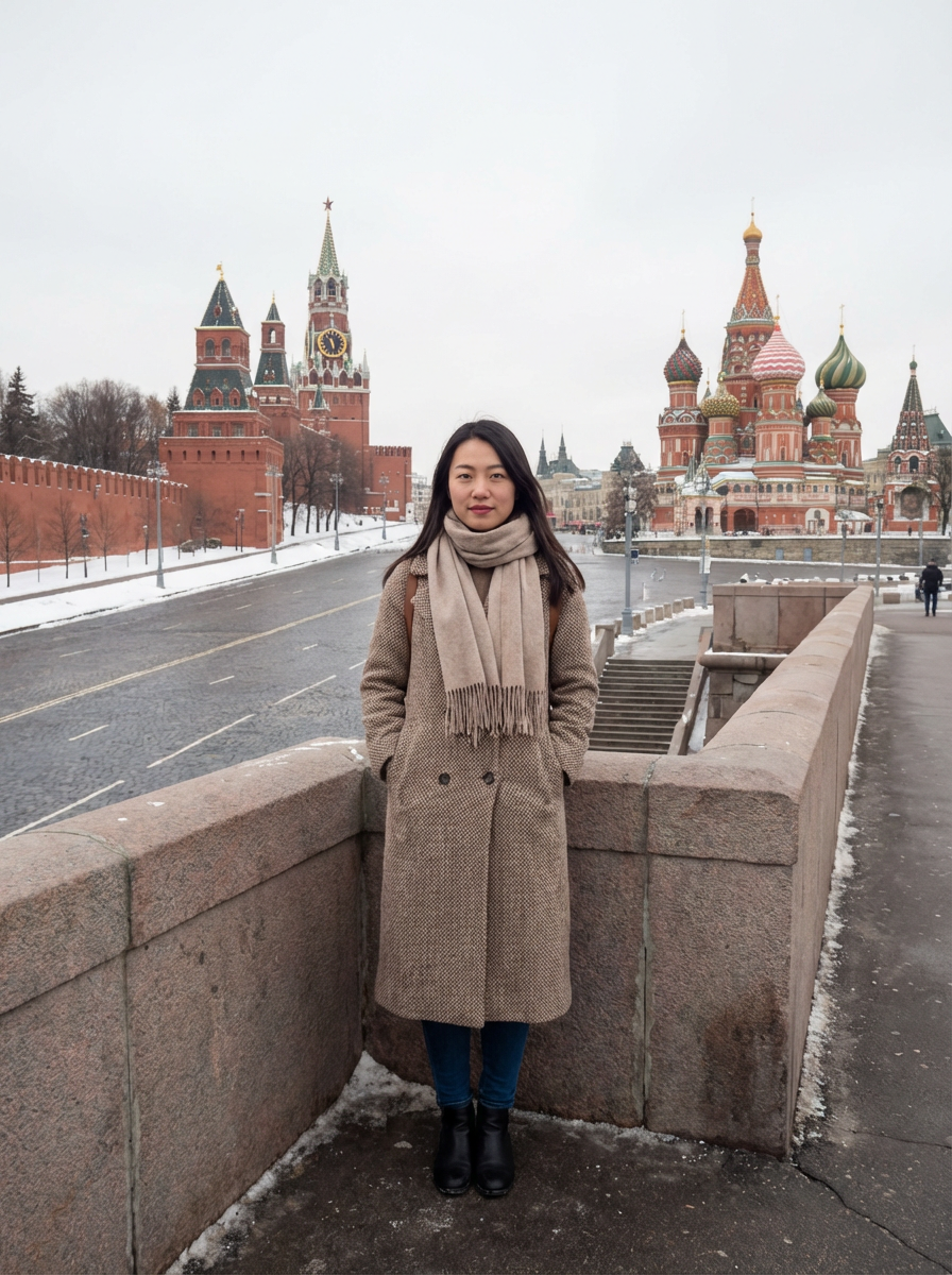 model in Moscow with the Kremlin in the background