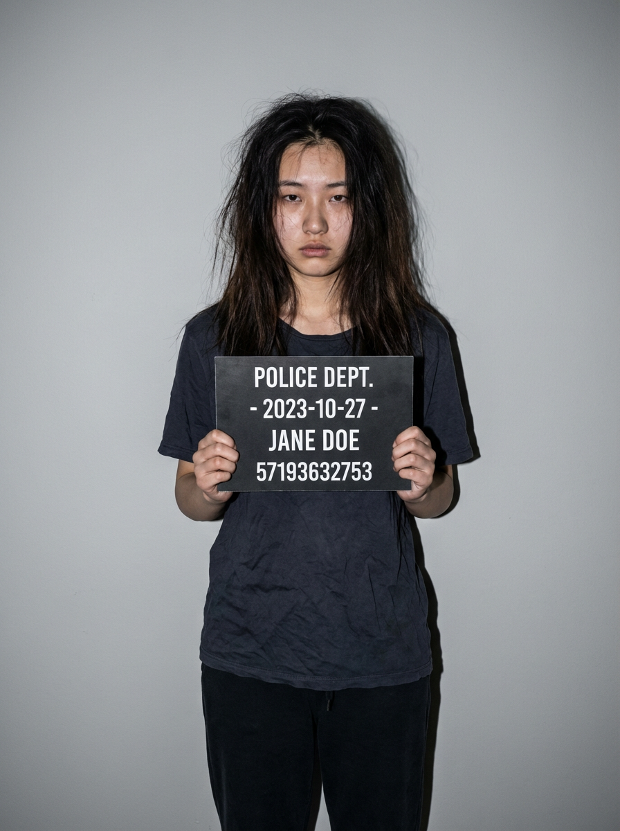 model in mugshot with messy appearance, just arrested look, harsh flash photography, gray background