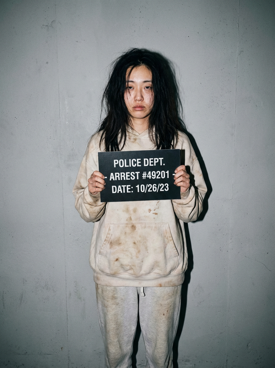model in mugshot with messy appearance, just arrested look, harsh flash photography, gray background
