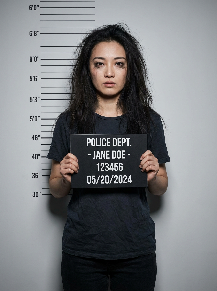 model in mugshot with messy appearance, just arrested look, harsh flash photography, gray background