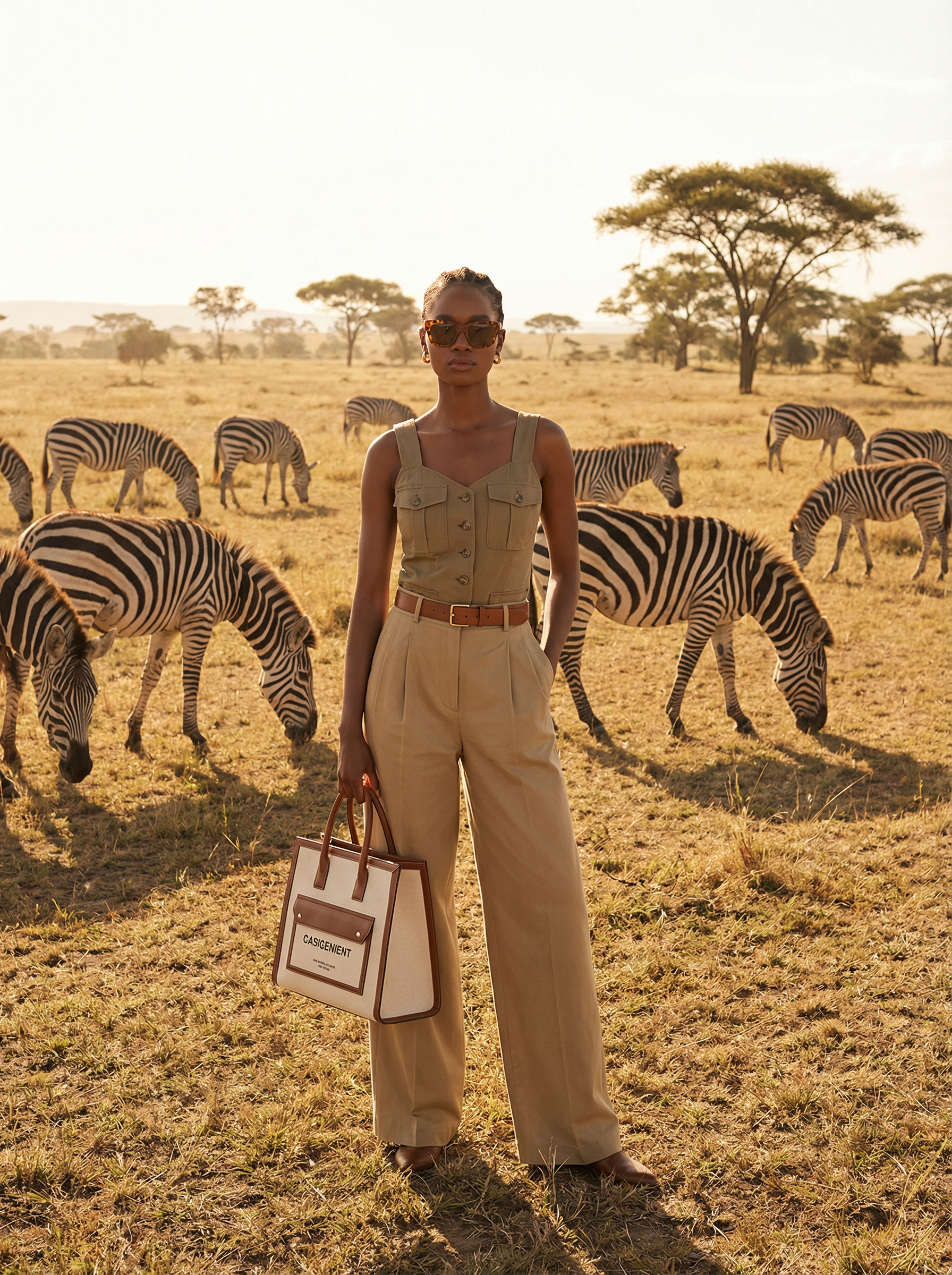 model in neutral safari-luxe: structured vest top, wide-leg trousers, belt, sunglasses, designer bag on an open savanna-style landscape staged like a fashion campaign, 15 zebras grazing peacefully around the model, golden afternoon light, magazine editorial composition, crisp realism
