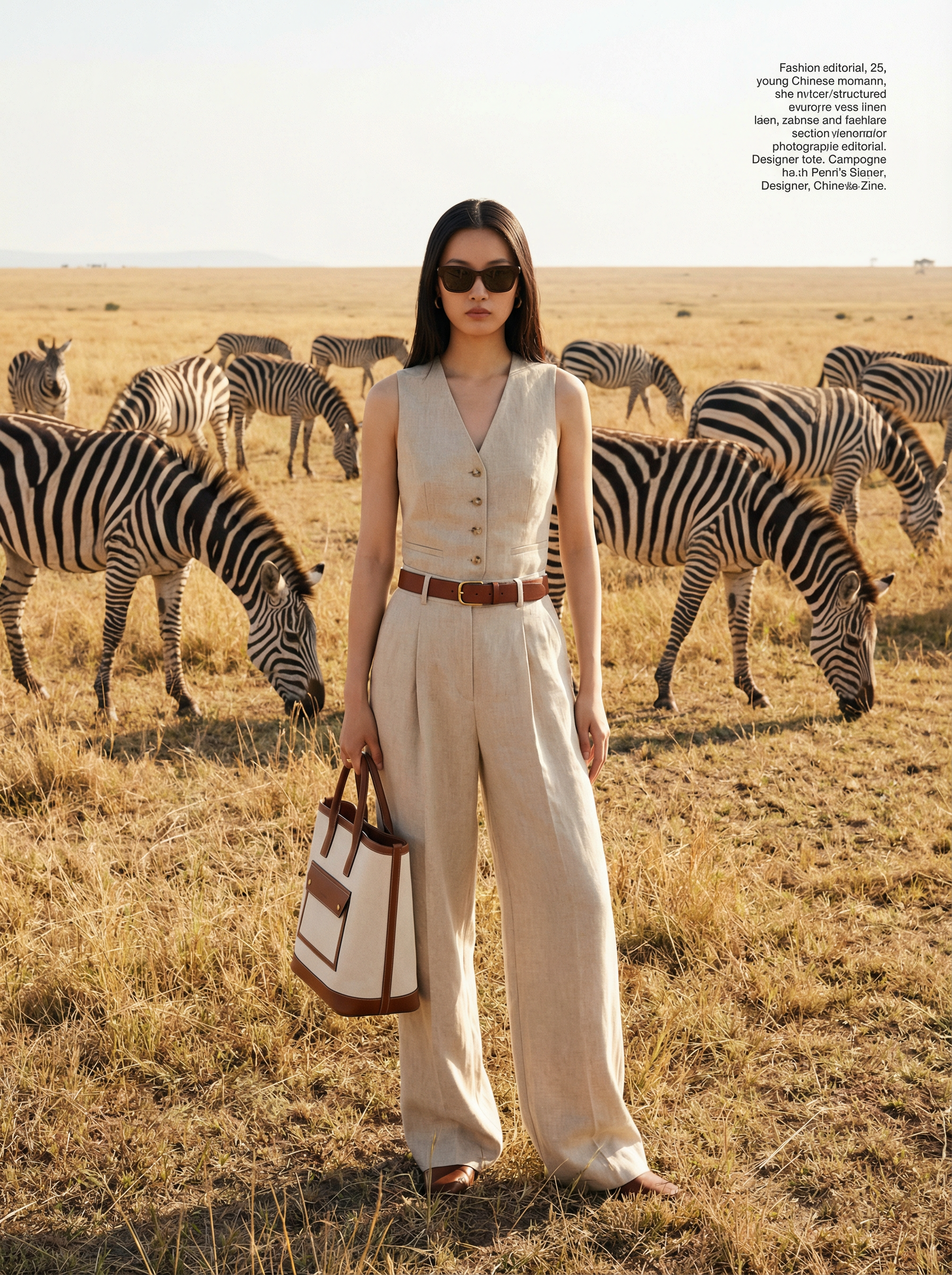 model in neutral safari-luxe: structured vest top, wide-leg trousers, belt, sunglasses, designer bag on an open savanna-style landscape staged like a fashion campaign, 15 zebras grazing peacefully around the model, golden afternoon light, magazine editorial composition, crisp realism