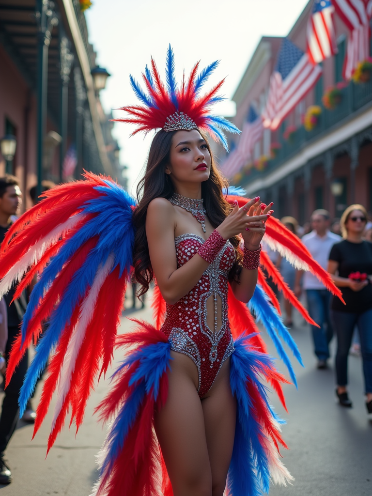 model in New Orleans during Mardi Gras, wearing a dazzling red, white, and blue carnival outfit with star-spangled feathers , throwing red, white, and blue beads to the crowd, American flags lining Bourbon Street