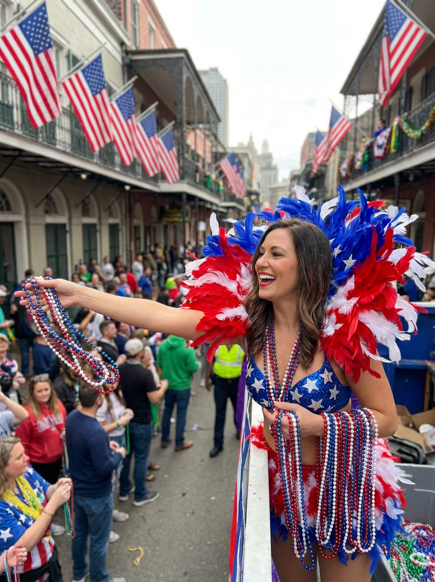 model in New Orleans during Mardi Gras, wearing a dazzling red, white, and blue carnival outfit with star-spangled feathers , throwing red, white, and blue beads to the crowd, American flags lining Bourbon Street