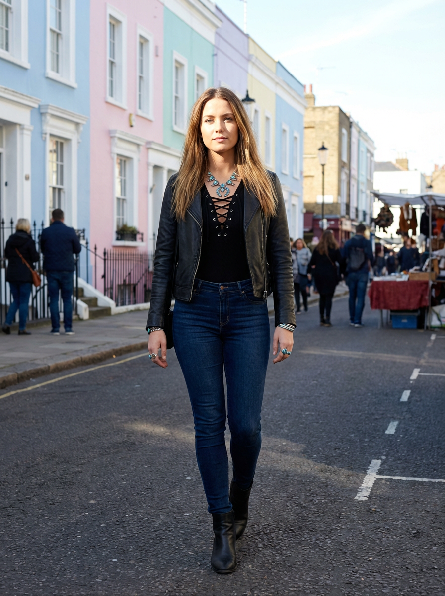 model in Notting Hill, colorful pastel houses, charming street scene, fashionable outfit, sunny day