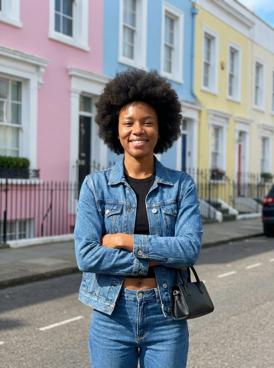 model in Notting Hill, colorful pastel houses, charming street scene, fashionable outfit, sunny day