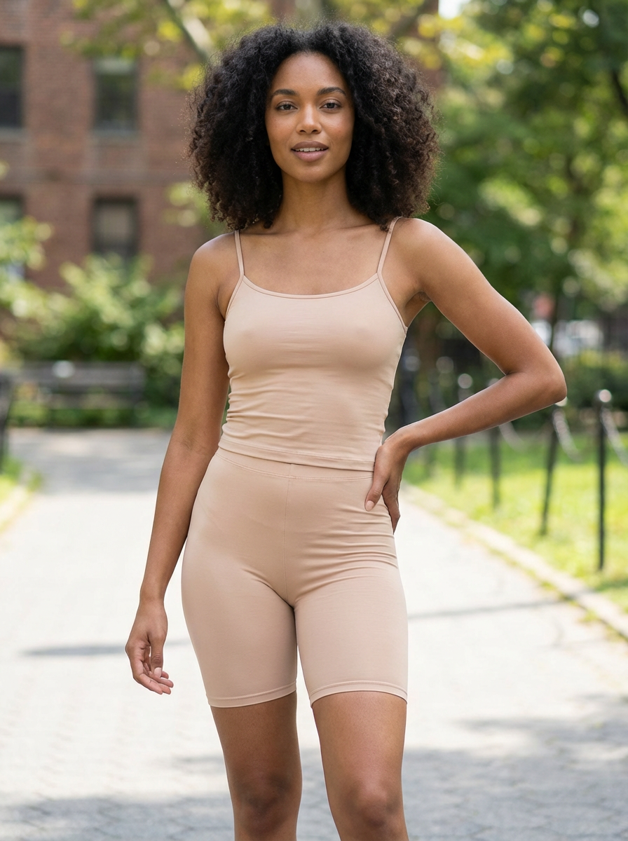 model in nude-toned spaghetti top and form fitting nude colored bicycle shorts