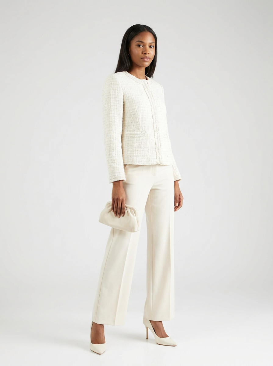 model in off-white tweed jacket with cream trousers and ivory heels , modern elevated off-white styling, clean backdrop, bright even lighting