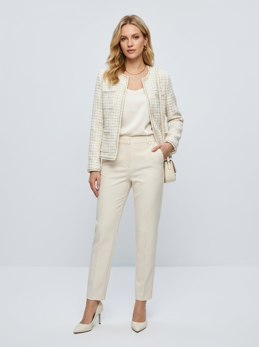 model in off-white tweed jacket with cream trousers and ivory heels , modern elevated off-white styling, clean backdrop, bright even lighting