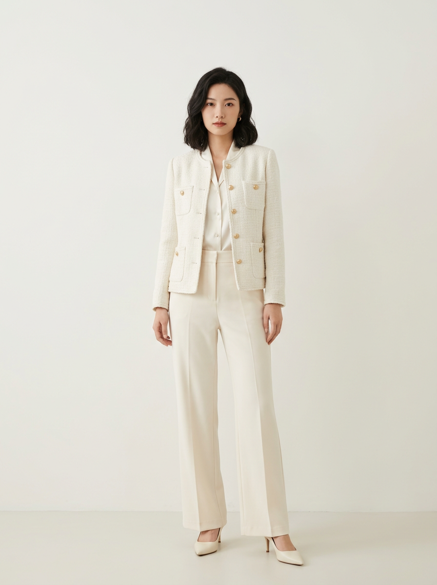 model in off-white tweed jacket with cream trousers and ivory heels , modern elevated off-white styling, clean backdrop, bright even lighting