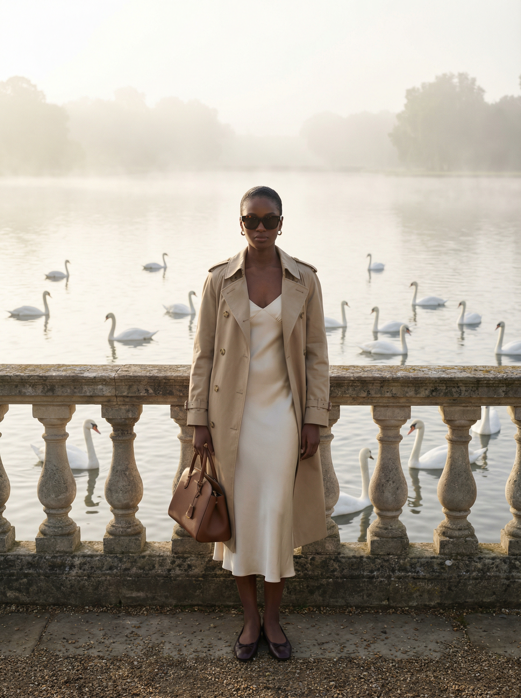 model in old-money lakeside: trench coat over silk slip, ballet flats, sunglasses, designer bag by a serene palace-like lake with stone balustrades, 15 swans gliding gracefully around the model on the water, soft morning mist, elegant editorial mood, photorealistic luxury campaign