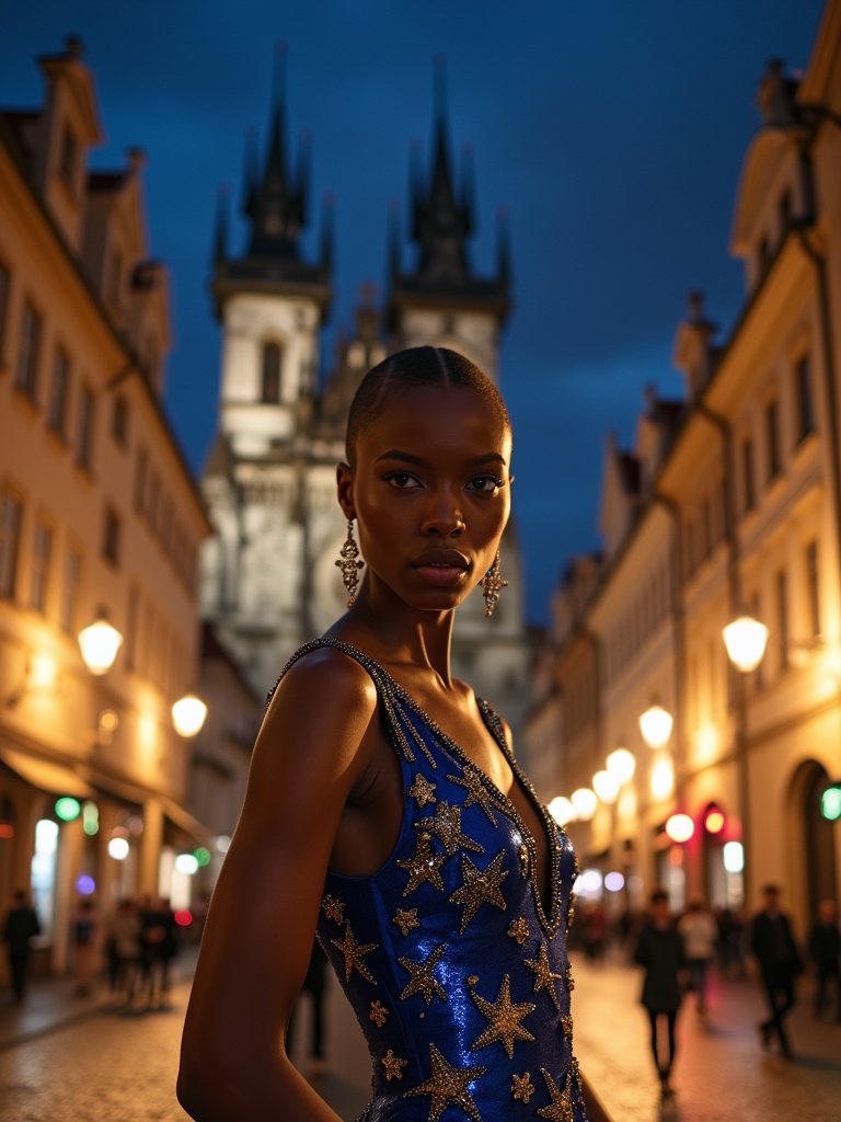 model in Prague's Old Town Square at night, surrounded by the iconic gothic architecture, wearing a glamorous blue sequined dress with gold star patterns , the historic astronomical clock and cobblestone streets creating a magical European atmosphere