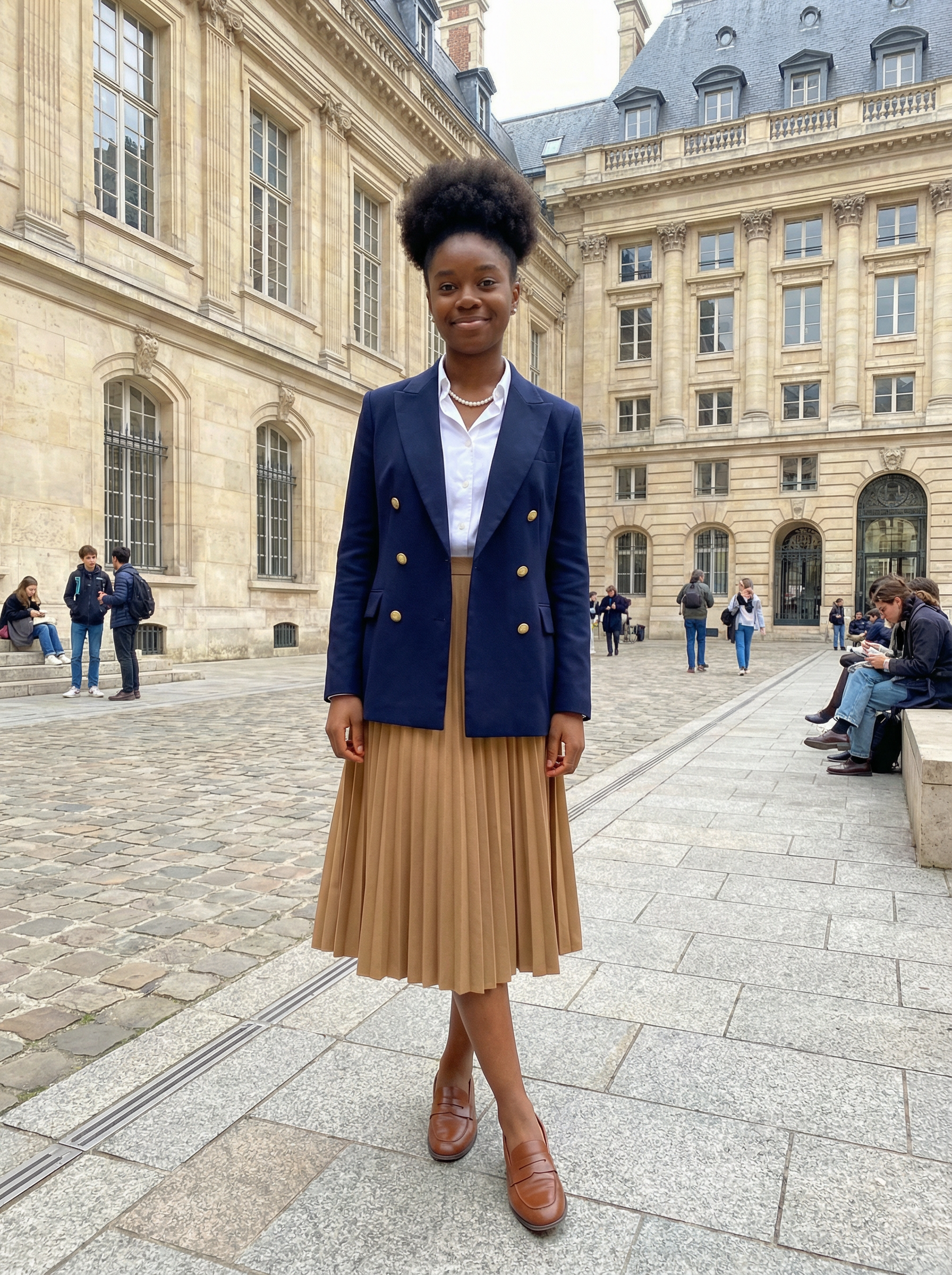model in preppy blazer, pleated skirt, loafers, pearl necklace at Sorbonne University courtyard, academic institution, historic university buildings, scholarly atmosphere, intellectual Paris, classical education setting