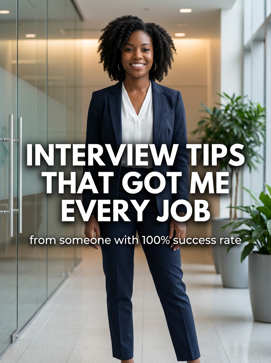 model in professional interview outfit in office building lobby, confident posture, professional lighting. TikTok text overlay: "interview tips that got me every job" smaller text: "(from someone with 100% success rate)" , do not show tiktok interface